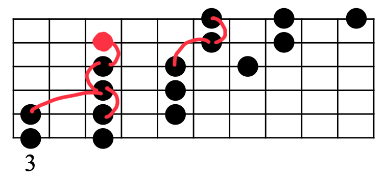 「2+3」のときよりも例外的な動きが多いのですが、こちらも基本的には隣り合う弦を使ってフレーズを作ります。