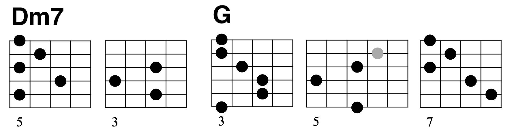 Dm7コード:Dマイナーペンタの音使いでダブルストップを弾いています。