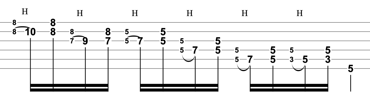 基本的には隣り合う2音を同時に押さえて、上の弦の音をハンマリングするという動作になっています。