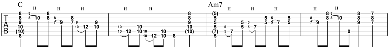 Am7コード : Am7の5フレット横一列に並んだ箇所を弾いたあと、7フレットの4弦ルートの形に移ります。