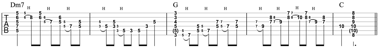 下のTAB譜は、C Am Dm G、それぞれのコードフォームから導き出されるダブルストップです。